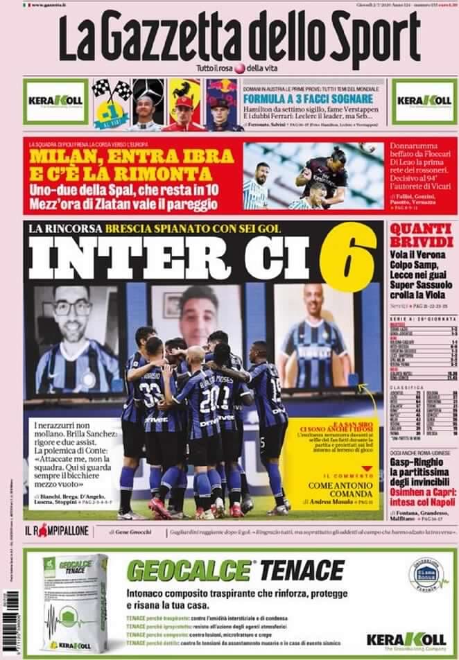 "Inter ci 6" scrive La Gazzetta dello Sport in apertura quest'oggi. Nerazzurri a valanga sul Brescia. Vittoria per 6-0 per la formazione di Antonio Conte che rimane in scia di Juventus e Lazio. Brilla Alexis Sanchez: un gol e due assist. La polemica di Conte: "Attaccate me, non la squadra. Qui si guarda sempre il bicchiere mezzo vuoto".