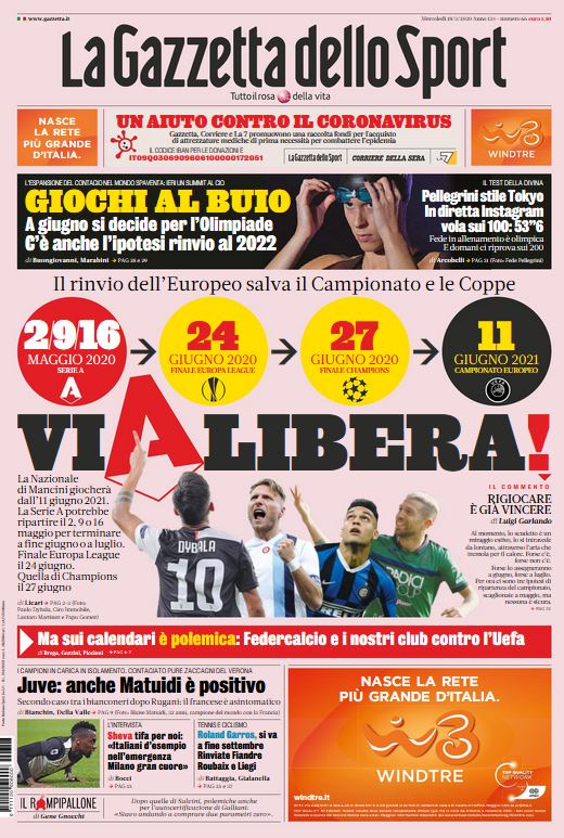 "Polemica sui calendari, Federcalcio e i nostri club contro la Uefa" si legge in prima pagina sull'edizione odierna de La Gazzetta dello Sport. Nonostante il rinvio degli Europei c'è ancora distanza tra le parti per la ripresa del campionato e la costruzione dei nuovi calendari. In basso la notizia di Matuidi che, dopo Rugani, è il secondo calciatore della Juventus positivo al Coronavirus. In alto l'ipotesi rinvio al 2022 dell'Olimpiade di Tokyo: al momento nessuna comunicazione ufficiale.