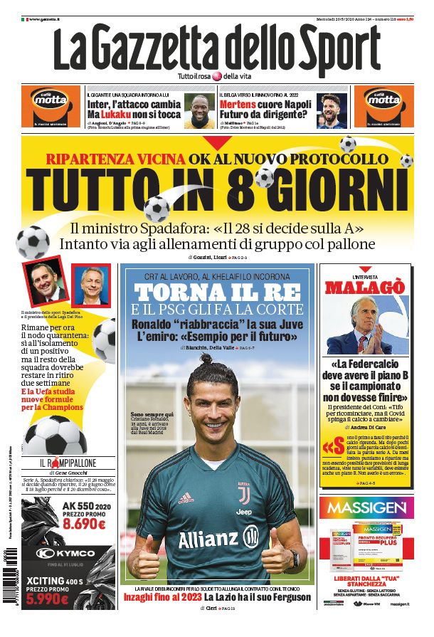"Ripartenza vicina! Mertens, futuro da dirigente?" sono alcuni dei titoli in prima pagina de La Gazzetta dello Sport oggi in edicola. In primo piano l'ok al nuovo protocollo, in alto il futuro di Mertens che sta per rinnovare col Napoli e che intanto riflette su un futuro dietro la scrivania. Accanto a Ciro un altro belga come Lukaku al centro del progetto Inter. Di spalla alcuni argomenti affrontati nella sua intervista da Malagò, presidente Coni.