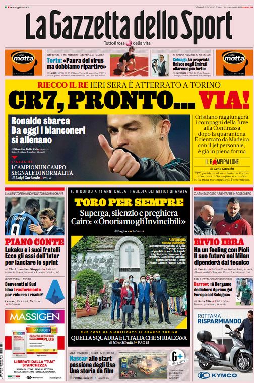 "Ronaldo è tornato! Il calcio si sposta al Sud?" sono alcuni dei titoli in prima pagina sull'edizione odierna de La Gazzetta dello Sport. Il portoghese della Juve è rientrato in Italia, di spalla Lukaku e l'Inter, l'idea campionato al Sud per ridurre i rischi, a destra il futuro sospeso di Ibrahimovic e in primo piano il ricordo di Superga a 71 anni (ieri) dalla tragedia del Grande Torino.