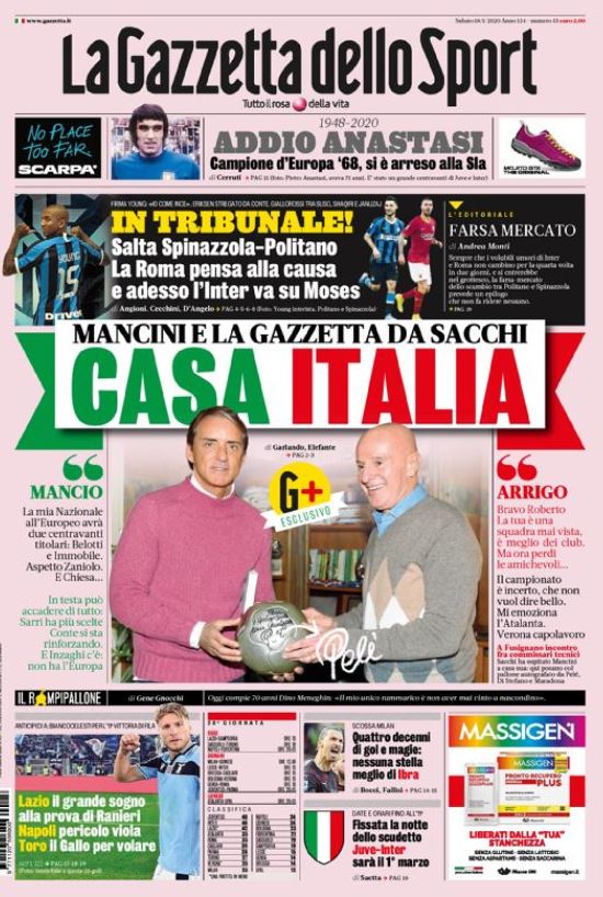 Lutto in casa Italia - “Addio Anastasi”. Nel taglio alto una notizia triste, ovvero la morte dell’ex bomber azzurro. Nella titolazione si legge: “Campione d’Europa ‘68, si è arreso alla Sla. È stato un grande centravanti di Juve e Inter”.