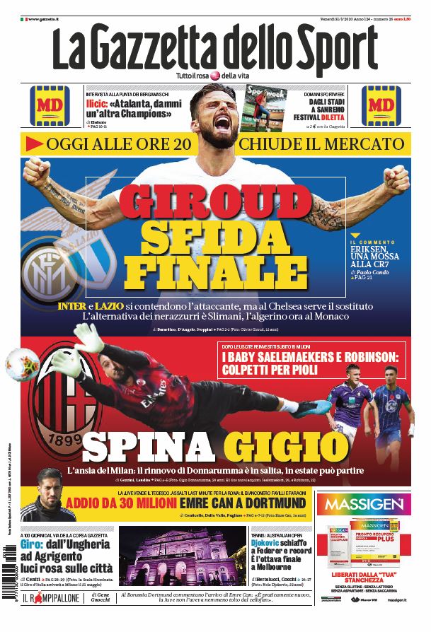 "Giroud sfida finale. Spina Gigio": doppio titolo d'apertura per La Gazzetta dello Sport in edicola oggi. Si parla di calciomercato, arrivato ormai alle battute finali. Inter e Lazio si contendono Giroud, attaccante del Chelsea, che deve prima trovare un sostituto. L'alternativa per i nerazzurri è Slimani del Monaco. Intanto, il Milan, che ha acquistato i giovani Saelamaekers e Robinson, è in ansia per il rinnovo di Donnarumma: senza prolungamento, Gigio può partire in estate.