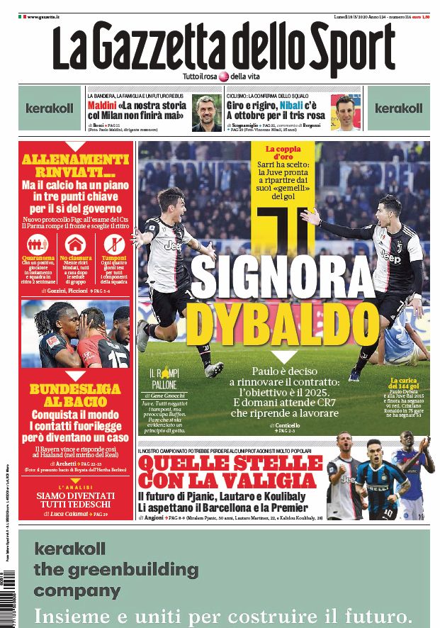 "Signora Dybaldo" è il titolo d'apertura dell'edizione odierna de La Gazzetta dello Sport. Sarri ha scelto: la Juve riparte dai suoi gemelli del gol. Paulo è deciso a rimanere alla Juventus, rinnovando il suo contratto fino al 2025. E domani attende il ritorno di Cristiano Ronaldo, che riprenderà a lavorare alla Continassa, dopo la quarantena.