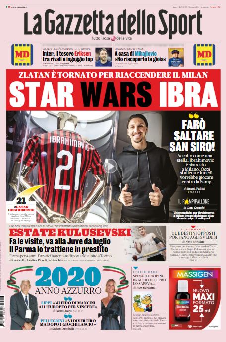 "Star Wars Ibra". Si apre così l'edizione odierna de La Gazzetta dello Sport questa mattina in edicola, in riferimento alla giornata di ieri che ha visto Zlatan Ibrahimovic tornare a casa Milan. Accolto come una stella, Ibra è sbarcato a Milano ieri e oggi si allena e lunedì vorrebbe giocare contro la Samp.
