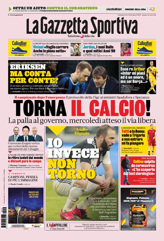 PRIMA PAGINA - Gazzetta: "Torna il calcio!". E su Higuain: "Io invece non torno..."