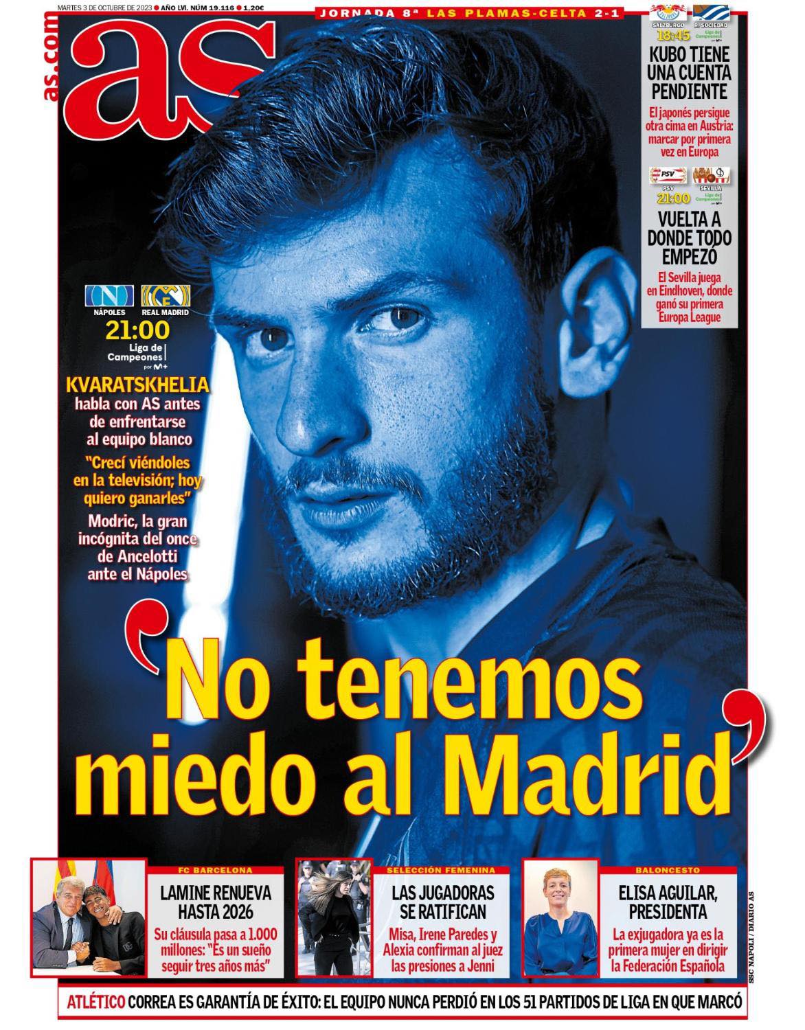 Il quotidiano spagnolo As apre in prima pagina con l’intervista a Khvicha Kvaratskhelia in vista del match di questa sera di Champions League tra Napoli e Real Madrid: “Non abbiamo paura del Real Madrid”.