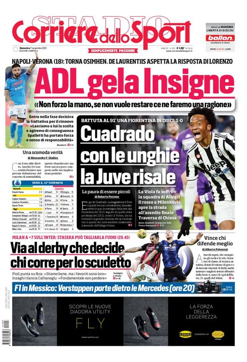 ADL gela Insigne, titola l'edizione campana del Corriere dello Sport in merito alle dichiarazioni del presidente del Napoli che ha dichiarato di attendere la risposta di Lorenzo: "Non forzo la mano, se non vuole restare ce ne faremo una ragione". La trattativa è nella fase decisiva: "Lasciamo a lui la scelta e agiremo di conseguenza". In taglio centrale la Juventus con "Cuadrado con le unghie" ed in basso il derby "che decide chi corre per lo Scudetto".