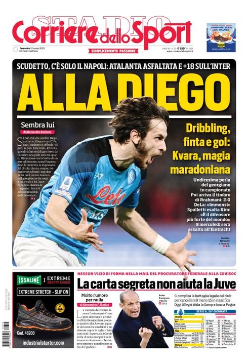 “Alla Diego”. Titola così al centro il Corriere dello Sport nella sua edizione Campania di oggi. "Scudetto, c'è solo il Napoli: asfaltata l'Atalanta e +18 sull'Inter. Dribbling, finta e gol: Kvara, magia maradoniana. Undicesima perla del georgiano in campionato. Poi arriva il timbro di Rrahmani: 2-0. E mercoledì sera assalto all'Eintracht".