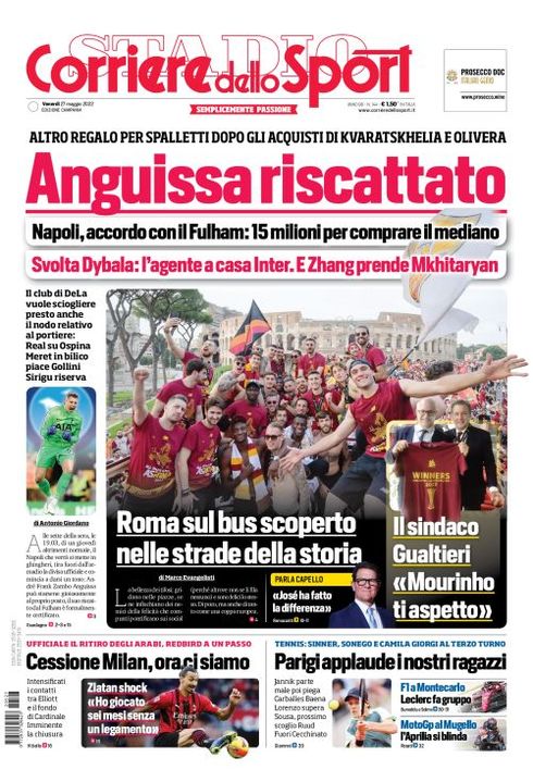 Il Corriere dello Sport, nella sua edizione Campania di oggi, apre in prima pagina con il mercato del Napoli: “Anguissa riscattato. Altro regalo per Spalletti dopo gli acquisti di Kvaratskhelia e Olivera. Napoli, accordo col Fulham: 15 milioni per comprare il mediano. Il club di DeLa vuole sciogliere presto anche il nodo relativo al portiere: Real su Ospina, Meret in bilico, piace Gollini, Sirigu riserva". Al centro si legge: "Svolta Dybala: l'agente a casa Inter. E Zhang prende Mkhitaryan".