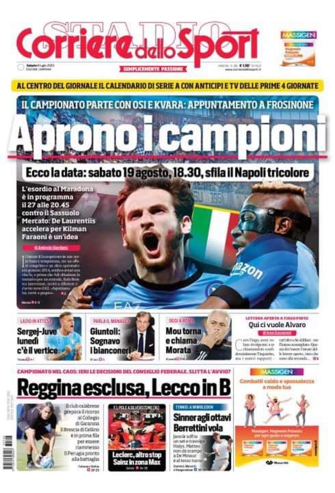“Aprono i campioni”. È questa l’apertura del Corriere dello Sport nella sua edizione Campania di oggi: “Il campionato parte con Osi e Kvara: appuntamento a Frosinone. Ecco la data: 19 agosto, ore 18,30, sfila il Napoli tricolore. L’esordio al Maradona è in programma il 27 alle 20:45 contro il Sassuolo. Mercato: De Laurentiis accelera per Kilman. Faraoni è un’idea”.