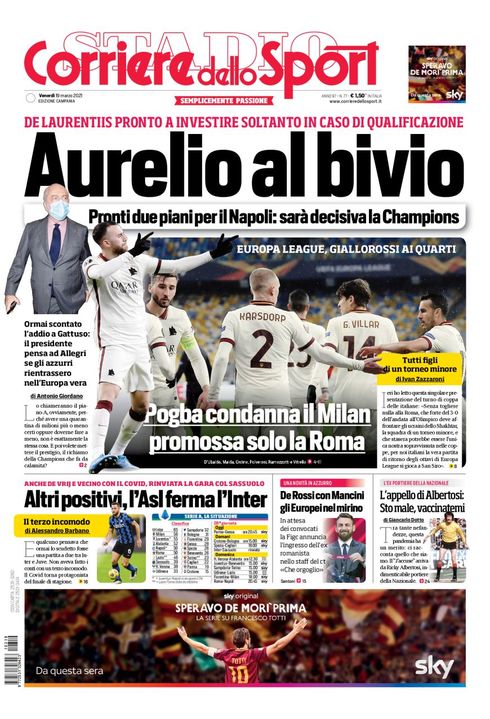 Il Corriere dello Sport, nella sua edizione Campania di oggi, apre in prima pagina con i piani futuri di De Laurentiis: "Aurelio al bivio. Pronti due piani per il Napoli: sarà decisiva la Champions". Al centro il passaggio del turno in Europa League della Roma e l'uscita di scena del Milan: "Pogba condanna il Milan, promossa solo la Roma". In basso il focolaio Covid in casa Inter e il provvedimento dell'Asl: "Altri positivi, l'Asl ferma l'Inter".