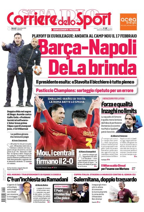 Il Corriere dello Sport, nella sua edizione Campania di oggi, apre in prima pagina con lo spareggio di Europa League tra Barcellona e Napoli: "Barça-Napoli: DeLa brinda. Playoff di Europa League: andata il 17 febbraio al Camp Nou. Il presidente esulta: "Stavolta il bicchiere è mezzo pieno". Doppia sfida nel segno di Diego: Aurelio carica". Spazio anche al pasticcio dei sorteggi di Champions League: "Sorteggio ripetuto per errore. Gaffe Uefa: l'inter trova prima l'Ajax e poi il Liverpool. Juve, c'è il Villarreal". Al centro spazio alla vittoria della Roma sullo Spezia: "Mou, i centrali firmano il 2-0".