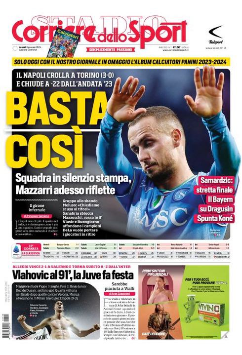 Il Corriere dello Sport, nella sua edizione Campania di oggi, dedica la prima pagina al momento nero del Napoli, che crolla Torino 3-0: "Basta così. Squadra in silenzio stampa, Mazzarri adesso riflette". Spazio anche al mercato azzurro: "Samardzic stretta finale. Il Bayern su Dragusin. Spunta Koné".