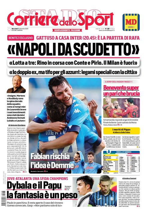 Il Corriere dello Sport apre in prima pagina, nella edizione Campania odierna, con le parole dell'ex tecnico azzurro Rafa Benitez: "Napoli da Scudetto. Lotta a tre: Rino in corsa con Conte e Pirlo. Il Milan è fuori. Io doppio ex ma tifo per gli azzurri: legami speciali con la città". Al centro spazio alle scelte di Gattuso per la sfida di stasera contro l'Inter: "Fabian rischia, l'idea é Demme".