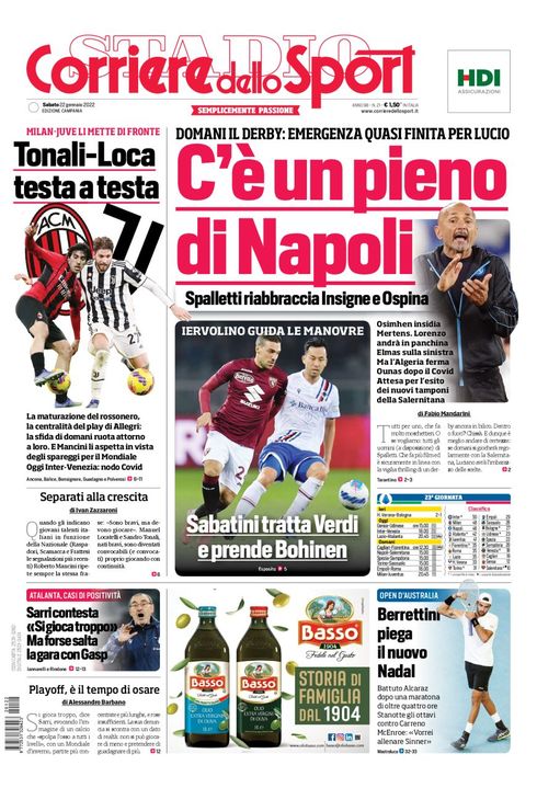 Il Corriere dello Sport, nella sua edizione Campania di oggi, apre in prima pagina con il derby campano tra Napoli e Salernitana: “C’è un pieno di Napoli. Domani il derby: emergenza quasi finita per Lucio. Spalletti riabbraccia Insigne e Ospina. Osimhen insidia Mertens. Lorenzo andrà in panchina, Elmas sulla sinistra. Ma l'Algeria ferma Ounas dopo il Covid. Attesa per l'esito dei nuovi tamponi della Salernitana". Al centro il calciomercato della Salernitana e sulla sinistra il big match tra Milan e Juve.