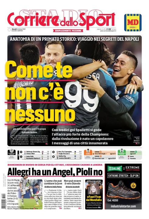 Il Corriere dello Sport, nella sua edizione di oggi, apre in prima pagina con il record del Napoli in Champions League: ”'Come te non c'è nessuno. Con tredici gol Spalletti si gode l'attacco più forte della Champions: dalla rivoluzione è nato un capolavoro. I messaggi di una città innamorata".