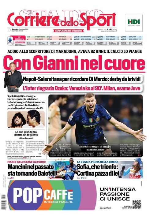 Il Corriere dello Sport, nella sua edizione Campania di oggi, apre con l'addio all'ex tecnico del Napoli Gianni Di Marzio: "Con Gianni nel cuore. Napoli-Salernitana per ricordare Di Marzio: derby da brividi". A centro pagina spazio alle scelte di Spalletti per la sfida del Maradona: "Spalletti si affida a Insigne, Mertens preferito a Osimhen, Lobotka in regia. Colantuono senza tredici giocatori. Dubbio Belec: pronto Guerrieri. In campo alle 15". A centro pagina spazio alle milanesi: "L'Inter ringrazia Dzeko: Venezia ko al 90'. Milan, esame Juve".