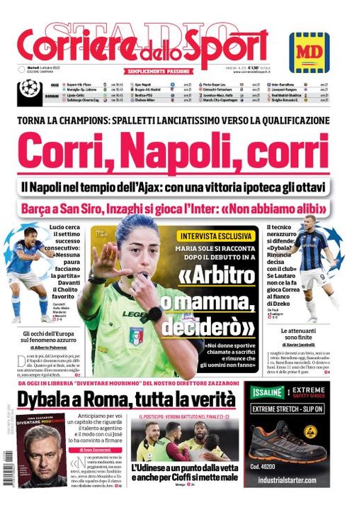 Il Corriere dello Sport, nella sua edizione Campania di oggi, apre in prima pagina con la sfida di Champions League tra Ajax e Napoli: "Corri, Napoli, corri. Torna la Champions: Spalletti lanciatissimo verso la qualificazione". In taglio basso un'anticipazione del libro 'Diventare Mourinho', che svela come il portoghese ha convinto la Joya a trasferirsi alla Roma: "Dybala a Roma, tutta la verità".