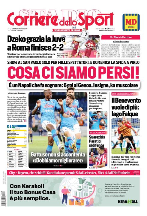 Il Corriere dello Sport nelle sua edizione Campania apre con la vittoria degli azzurri nella seconda di Campionato: "E' un Napoli che fa sognare: 6 gol al Genoa. Show al San Paolo solo per mile spettatori. E domenica sfida a Pirlo. Insigne, Ko muscolare". In alto spazio ai prossimi avversari degli azzurri che pareggiano a Roma: "Dzeko grazie la Juve".