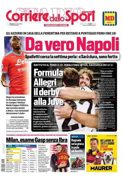 "Da vero Napoli", titola così in prma pagina il Corriere dello Sport, nella sua edizione Campania di oggi. "Gli azzurri in casa della Fiorentina per restare a punteggio pieno (ore 18). Spalletti cerca la settima perla: 'Sarà dura, sono forti'. Dopo lo scivolone in Europa tornano in campo i titolari. Nodo Coppa d'Africa, dal tecnico assiste a DeLa: 'Le Nazionali devastano i club". In taglio basso spazio al posticipo tra Atalanta e Milan: "Milan, esame Gasp senza Ibra".