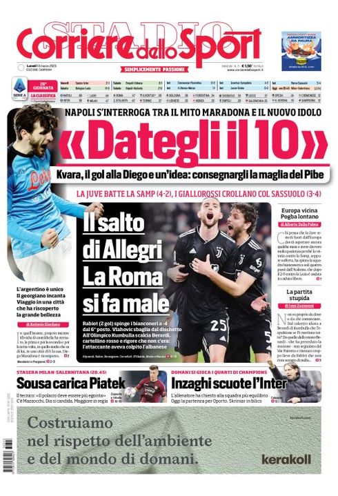"Dategli il 10", apre così il Corriere dello Sport nella sua edizione Campania di oggi. "Kvara, il gol alla Diego e un'idea: consegnarli la maglia del Pibe. Napoli s'interroga tra il mito Maradona e il nuovo idolo". In taglio basso spazio all'Inter, che domani si gioca l'accesso ai quarti di finale di Champions League: "Inzaghi scuote l'Inter".