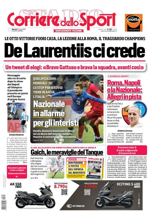 Il Corriere dello Sport, nella sua edizione Campania di oggi, apre in prima pagina con De Laurentiis che crede nel quarto posto: “De Laurentiis ci crede. Un tweet di elogi: "Bravo Gattuso e brava la squadra, avanti così"". Al centro la situazione legata al Covid dei calciatori dell'Inter impegnati in nazionale: "Nazionale in allarme per gli interisti". Di spalla il futuro di Max Allegri: "Roma, Napoli o la Nazionale: Allegri in pista".