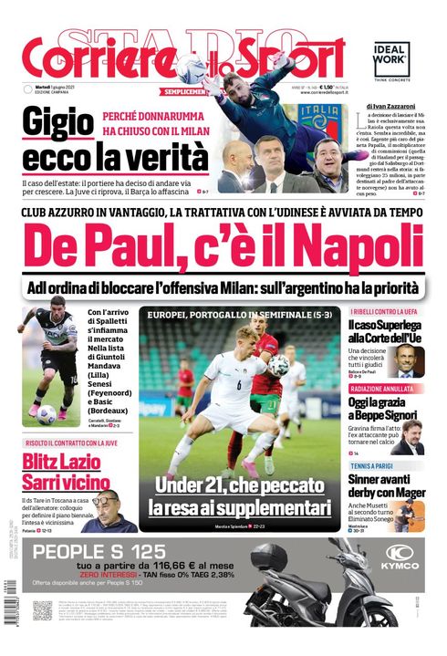 Il Corriere dello Sport, nella sua edizione Campania di oggi, apre in prima pagina con il forte interesse del Napoli per De Paul: “De Paul, c’è il Napoli. Club azzurro in vantaggio, la trattativa con l'Udinese è avviata da tempo. Adl ordina di bloccare l'offensiva del Milan: sull'argentino ha la priorità". In alto la situazione legata al futuro di Donnarumma. Al centro spazio all'eliminazione dagli Europei Under 21 dell'Italia: "Under 21, che peccato: la resa ai supplementari". Sulla destra il caos Superlega e sulla sinistra la trattativa tra la Lazio e Sarri.
