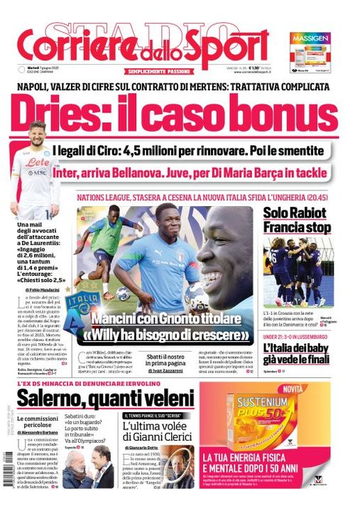 Il Corriere dello Sport, nella sua edizione Campania di oggi, apre in prima pagina con la vicenda legata a Mertens: "Dries: il caso bonus. Napoli, valzer di cifre sul contratto di Mertens: trattativa complicata. I legali di Ciro: 4,5 milioni per rinnovare. Poi le smentite. Una mail degli avvocati dell'attaccante a De Laurentiis: 'Ingaggio di 2,6 milioni, una tantum di 1,4 e premi'. L'entourage: 'Chiesti solo 2,5'". In taglio alto spazio alle mosse di Juve e Inter: "Inter, arriva Bellanova. Juve, per Di Maria Barça in tackle". Di spalla spazio alla Nations League: "Solo Rabiot, Francia stop". Al centro si parla di Italia-Ungheria: "Mancini con Gnonto titolare: 'Willy ha bisogno di crescere'".Spazio anche all'U21: "L'Italia dei baby già vede le finali". In taglio basso spazio alla rottura tra Iervolino e Walter Sabatini: "Salerno, quanti veleni".