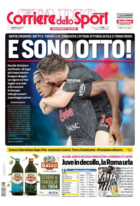 Il Corriere dello Sport, nella sua edizione Campania di oggi, apre in prima pagina con l'ottava vittoria del Napoli sulle prime otto gare di campionato: "E sono otto! Decide Osimhen nel finale: 'E' il gol più importante'. Insigne sbaglia un rigore e il VAR toglie una rete a Di Lorenzo. In Europa solo gli azzurri a punteggio pieno". In basso spazio alla vittoria della Juventus contro la Roma tra le polemiche: "Juve in decollo, la Roma urla".