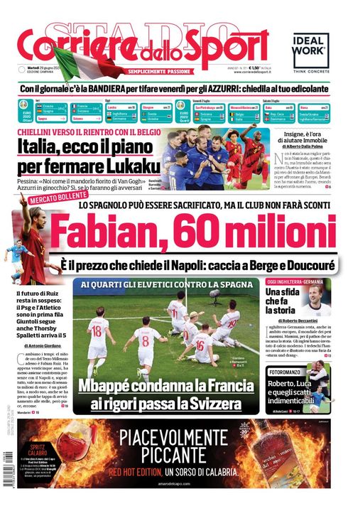 “Fabian, 60 milioni. Lo spagnolo può essere sacrificato, ma il club non farà sconti. E' il prezzo che chiede il Napoli: caccia a Berge e Doucourè”. Il Corriere dello Sport, nella sua edizione Campania di oggi, apre in prima pagina con il mercato del Napoli. Spazio anche all'eliminazione da Euro2020 della Francia: "Mbappè condanna la Francia, ai rigori passa la Svizzera". In alto, si parla di Italia-Belgio, prossima sfida dei quarti di finale degli Europei: "Italia, ecco il piano per fermare Lukaku".