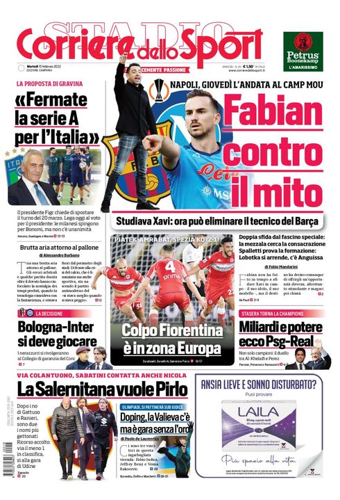 Il Corriere dello Sport, nella sua edizione Campania di oggi, apre in prima pagina con la sfida speciale per il centrocampista spagnolo: “Fabian contro il mito. Napoli, giovedì l'andata al Camp Nou. Stadiava Xavi: ora può eliminare il tecnico del Barça. Doppia sfida dal fascino speciale: la mezzala cerca la consacrazione. Spalletti prova la formazione: Lobotka si arrende, 'è Anguissa". Al centro il successo della Fiorentina contro lo Spezia, sulla sinistra Gravina propone: "Fermate la Serie A per l'Italia". Spazio anche alla sfida tra PSG-Real, mentre i nerazzurri dovranno rigiocare contro il Bologna.