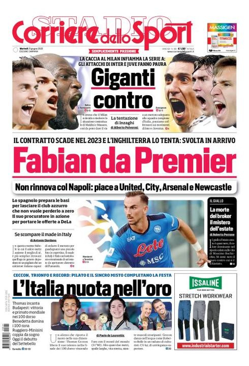 Il Corriere dello Sport, nella sua edizione Campania di oggi, apre in prima pagina con le sirene inglesi per Fabian Ruiz: ”Fabian da Premier. Il contratto scade nel 2023 e l'Inghilterra lo tenta: svolta in arrivo. Non rinnova col Napoli: piace a United, City, Arsenal e Newcastle. Lo spagnolo prepara le basi per lasciare il club azzurro. Il suo procuratore in azione per portare le offerte a DeLa". In taglio alto il duello e le mosse sul mercato di Inter e Juve: "Giganti contro".
