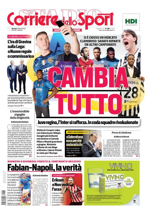 Il Corriere dello Sport, nella sua edizione Campania di oggi, apre in prima pagina con il futuro di Fabian Ruiz: “Fabian-Napoli, la verità. Rinnovo o divorzio: presto il confronto decisivo. Lo spagnolo ha il contratto in scadenza nel 2023: l'Arsenal è in prima fila ma si muovono anche United, City e Liverpool. E nell'asta può infilarsi il Real". In taglio centrale spazio al calciomercato appena terminato: "Cambia tutto".