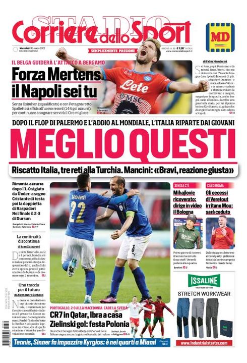 "Forza Mertens, il Napoli sei tu”, titola così in prima pagina il Corriere dello Sport nella sua edizione Campania di oggi. "Il belga guiderà l'attacco a Bergamo. Senza Osimhen (squalificato) e Petagna rotto, Spalletti si affida all'uomo record (144 gol azzurri): per continuare a sognare ci vorrà il Ciro migliore". Di spalla spazio al tecnico del Bologna che resta in contatto con la squadra dall'ospedale: "Mihajlovic ricoverato: dirige in video il Bologna". Sempre di spalla spazio al caso Veretout in casa Roma: "Gli eccessi di Veretout irritano Mou: sarà ceduto".