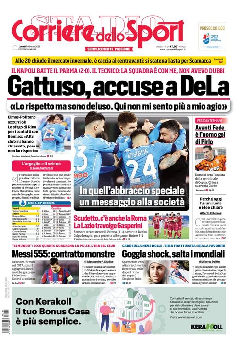 Il Corriere dello Sport, nella sua edizione Campania di oggi, apre in prima pagine con le esternazioni di Rino Gattuso nei confronti di De Laurentiis dopo la vittoria contro il Parma: "Lo rispetto ma sono deluso. Qui non mi sento più a mio agio". In basso l'immagine dell'esultanza del tecnico con i suoi ragazzi dopo il gol di Politano: "In quell'abbraccio speciale un messaggio alla società".