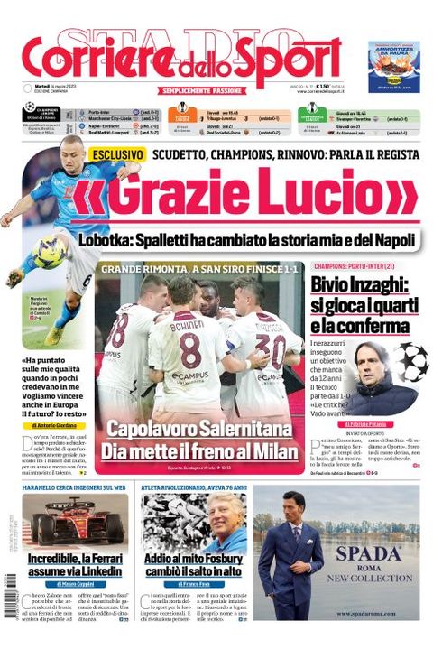 “Grazie Lucio”. Titola così al centro il Corriere dello Sport nella sua edizione Campania di oggi che apre con l'intervista a Lobotka: "Spalletti ha cambiato la storia mia e del Napoli. Ha puntato sulle mie qualità quando in pochi credevano in me. Vogliamo vincere anche in Europa. Futuro? Io resto".