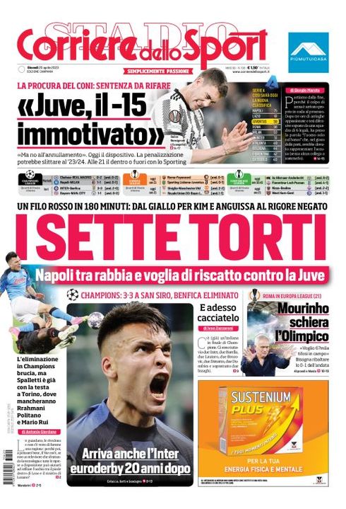 Il Corriere dello Sport, nella sua edizione Campania di oggi, apre in prima pagina con gli errori arbitrali che hanno pesato sulla mancata qualificazione alle semifinali di Champions del Napoli: "I sette torti. Un filo rosso in 180 minuti: dal giallo a Kim e Anguissa al rigore negato. Napoli tra rabbia e voglia di riscatto contro la Juve. L'eliminazione in Champions brucia, ma Spalletti è già con la testa a Torino, dove mancheranno Rrahmani, Politano e Mario Rui".
