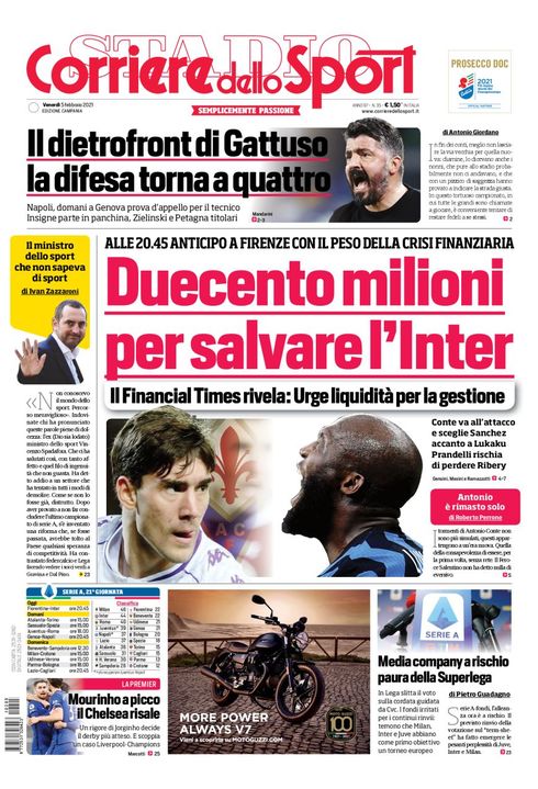 Il Corriere dello Sport, nella sua edizione Campania di oggi, apre in prima pagina con le scelte tattiche di Gattuso: "Il dietrofront di Gattuso, la difesa torna a quattro". Al centro spazio alla crisi finanziaria in casa Inter: "Duecento milioni per salvare l'inter".