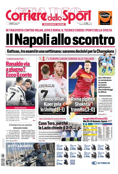 Il Corriere dello Sport, nella sua edizione Campania di oggi, apre in prima pagina con il trittico di scontri diretti che attende il Napoli: “Il Napoli allo scontro. Gattuso, tre esami in una settimana: saranno decisivi per la Champions”. Al centro spazio al Milan, che ha trovato il pareggio in extremis sul campo dello United: "Grande Milan: Kjaer gela lo United". "Roma gigante: Shakhtar travolto" per celebrare il netto successo dei giallorossi. Di spalla la Juventus: "Ronaldo via a giugno? Ecco il conto".