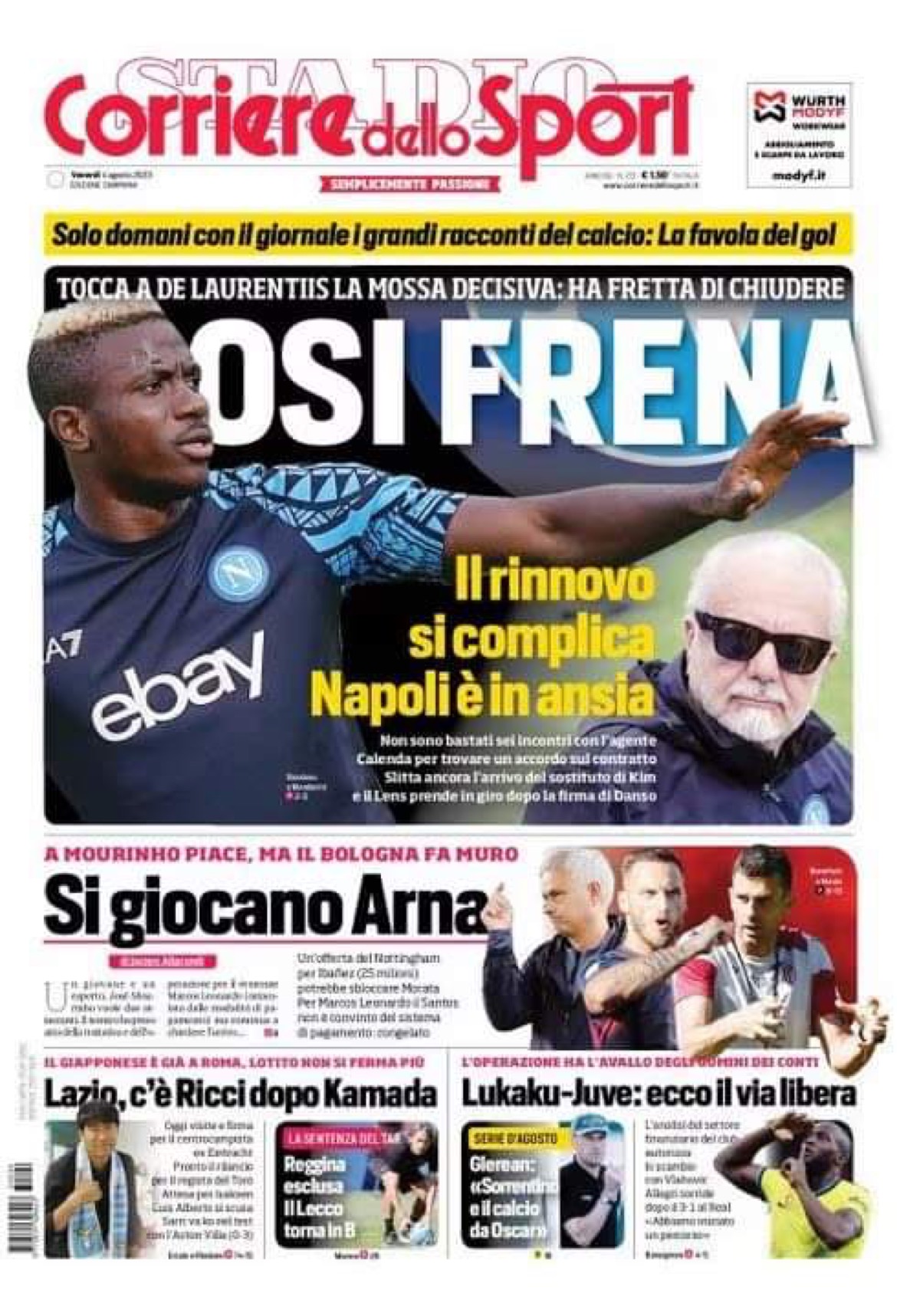 “Osi frena. Il rinnovo si complica. Napoli è in ansia”. Titola così il Corriere dello Sport nella sua edizione Campania di oggi: “Non sono bastati sei incontri con l’agente Calenda per trovare un accordo sul contratto. Slitta ancora l’arrivo del sostituto di Kim e il Lens prende in giro dopo la firma di Danso”.