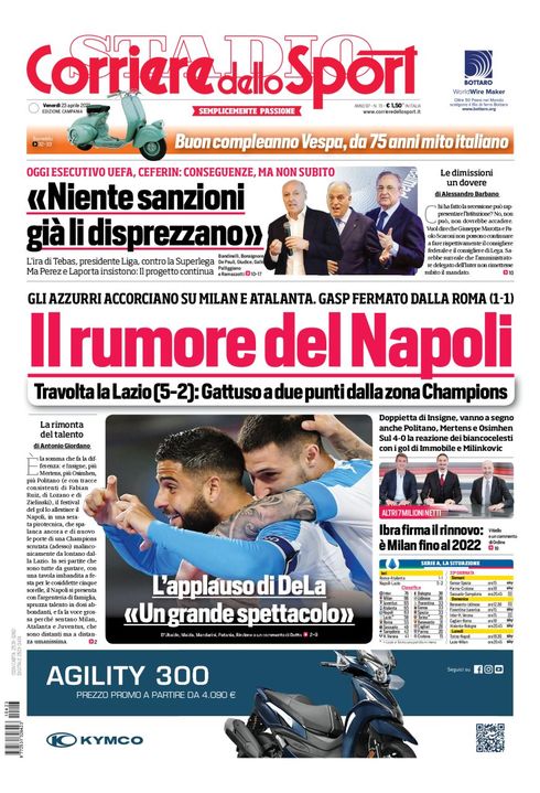 Il Corriere dello Sport, nella sua edizione Campania di oggi, apre in prima pagina con il netto successo del Napoli contro la Lazio nello scontro diretto per la Champions: “Il rumore del Napoli. Travolta la Lazio: Gattuso a due punti dalla zona Champions”. Al centro anche il tweet di complimenti arrivato dal presidente De Laurentiis: "L'applauso di DeLa: un grande spettacolo"". Sulla destra il rinnovo di Ibrahimovic con il Milan.