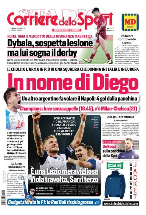 “In nome di Diego”. Titola così il Corriere dello Sport nella sua edizione Campania di oggi. "Il Cholito l'arma in più di una squadra che dominca in Italia e in Europa. Un altro argentino fa volare il Napoli: 4 gol dalla panchina. Spinto dal padre verso il tempio di Maradona, Simeone è già protagonista. Contro l'Ajax torna Osimhen. Ostigard titolare".