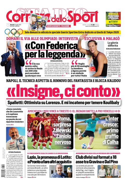Il Corriere dello Sport, nella sua edizione Campania di oggi, apre in prima pagina con le dichiarazioni di Spalletti rilasciate durante l'incontro in piazza con i tifosi a Dimaro: "Insigne, ci conto". Spalletti ottimista sul rinnovo di Lorenzo e blocca Koulibaly: "E mi incateno per trattenere Koulibaly". In taglio basso le rassicurazioni di Lotito a Sarri per il mercato della Lazio: "Pronto a fare altri acquisti".