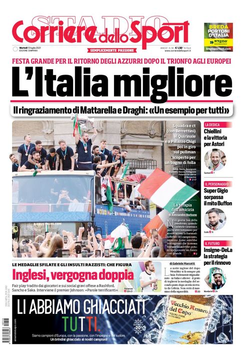 Il Corriere dello Sport, nella sua edizione Campania di oggi, apre in prima pagina con il futuro di Lorenzo Insigne: “Insigne-De La: la strategia per il rinnovo”. Al centro si parla della Nazionale Italiana: "L'Italia migliore". Nel taglio basso la critica agli avversari: "Inglesi, vergogna doppia". Mentre nel taglio laterale c'è spazio per i focus su Chiellini e Donnarumma.