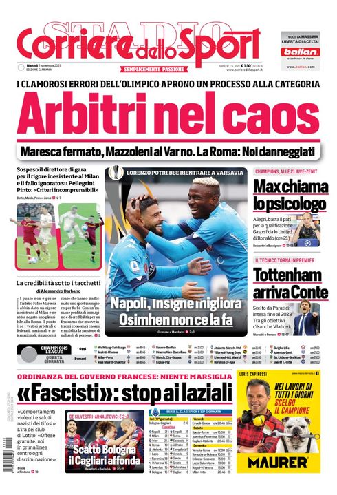 Il Corriere dello Sport, nella sua edizione Campania di oggi, apre in prima pagina con il Napoli, atteso fra due giorni dalla trasferta di Europa League in Polonia: "Insigne migliora. Osimhen non ce la fa. Lorenzo potrebbe rientrare a Varsavia". In taglio alto le polemiche arbitrali in Roma-Milan e le critiche rivolte all’arbitro Maresca: "Arbitri nel caos. I clamorosi errori dell’Olimpico aprono un processo alla categoria. Maresca fermato, Mazzoleni al Var no. La Roma: noi danneggiati. Sospeso il direttore di gara per il rigore inesistente al Milan e il fallo ignorato su Pellegrini”. Sulla destra si parla della Juventus e di Conte che torna in Premier, mentre in basso il Marsiglia che vieta la trasferata ai tifosi laziali.