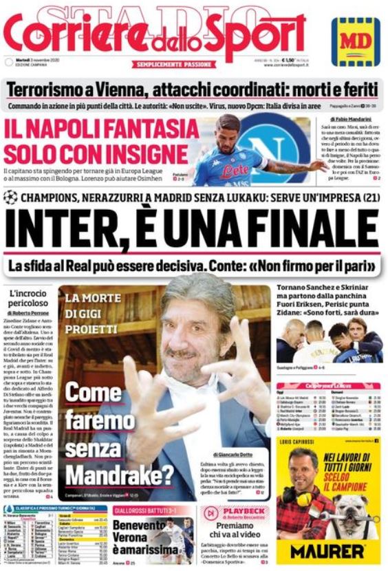 L'edizione di oggi de Il Corriere dello Sport Campania apre in prima pagina dando spazio al Napoli ed Insigne, con il capitano che starebbe spingendo per il rientro in campo già in Europa League contro il Rijeka, al più tardi contro il Bologna: "Il Napoli fantasia solo con Insigne. Lorenzo può aiutare Osimhen". Spazio poi agli impegni serali delle italiane in Champions League ed il duro attentato di Vienna.