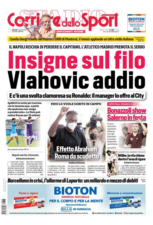 Il Corriere dello Sport, nella sua edizione Campania di oggi, apre in prima pagina con il futuro a Napoli di Insigne: “Il Napoli rischia di perdere il suo capitano. Insigne sul filo. Spalletti in ansia per Lorenzo: "Ce lo teniamo qua a patto che qualcuno non venga a prenderselo"". Spazio anche al calciomercato e a Vlahovic nek mirino dell'Atletico Madrid: "La Viola può cedere Dusan per 70 milioni". Clamorosa indiscrezione legata a Cristiano Ronaldo: "Svolta clamorosa su Ronaldo: il manager lo offre al City". Sulla destra la Coppa Italia e la Salernitana che ha battuto 2-0 la Reggina.