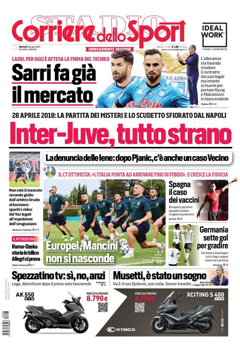 Il Corriere dello Sport, nella sua edizione Campania di oggi, apre in prima pagina con Inter-Juventus del 2018 che non smette di scatenare polemiche: “Inter-Juve, tutto strano. La denucia delle Iene: dopo Pjanic c'è anche un caso Vecino. Non solo il mancato secondo giallo dell'arbitro Orsato al bosniaco: spariti i video del Var legati all'espulsione dell'uruguaiano”. In taglio alto la Lazio che si appresta ad abbracciare Maurizio Sarri. Il tecnico già pensa la mercato: "Si muove per portare Hysaj e Maksimovic in biancoceleste". In taglio centrale la Nazionale Italiana con le parole di Mancini e sulla destra il caso vaccini che riguarda la Spagna.