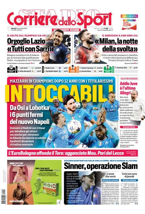 Il Corriere dello Sport, nella sua edizione Campania di oggi, apre in prima pagina con la sfida di Madrid che attende il Napoli in Champions: "Intoccabili. Mazzarri in Champions dopo 12 anni con i titolarissimi. Da Osi a Lobotka: i 6 punti fermi del Napoli". In taglio alto spazio a Lazio e Milan in campo oggi: "Orgoglio Lazio: 'Tutti con Sarri'". "Milan, la notte della svolta".