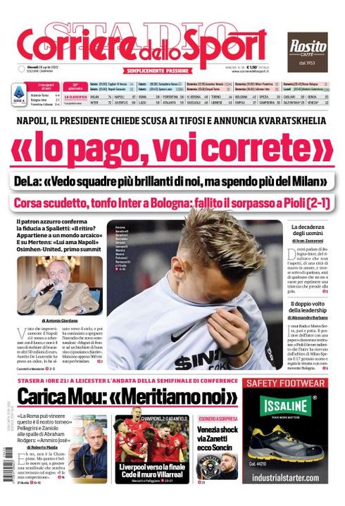 Il Corriere dello Sport, nella sua edizione Campania di oggi, apre in prima pagina con le parole del presidente Aurelio De Laurentiis dal centro sportivo di Castel Volturno: "Io pago, voi correte. Vedo squadre più brillante di noi, ma spendo più del Milan'. Il patron azzurro conferma la fiducia a Spalletti. 'Il ritiro? appartiene ad un mondo arcaico'. E su Mertens: 'Lui ama Napoli'. Osimhen-United, primo summit"